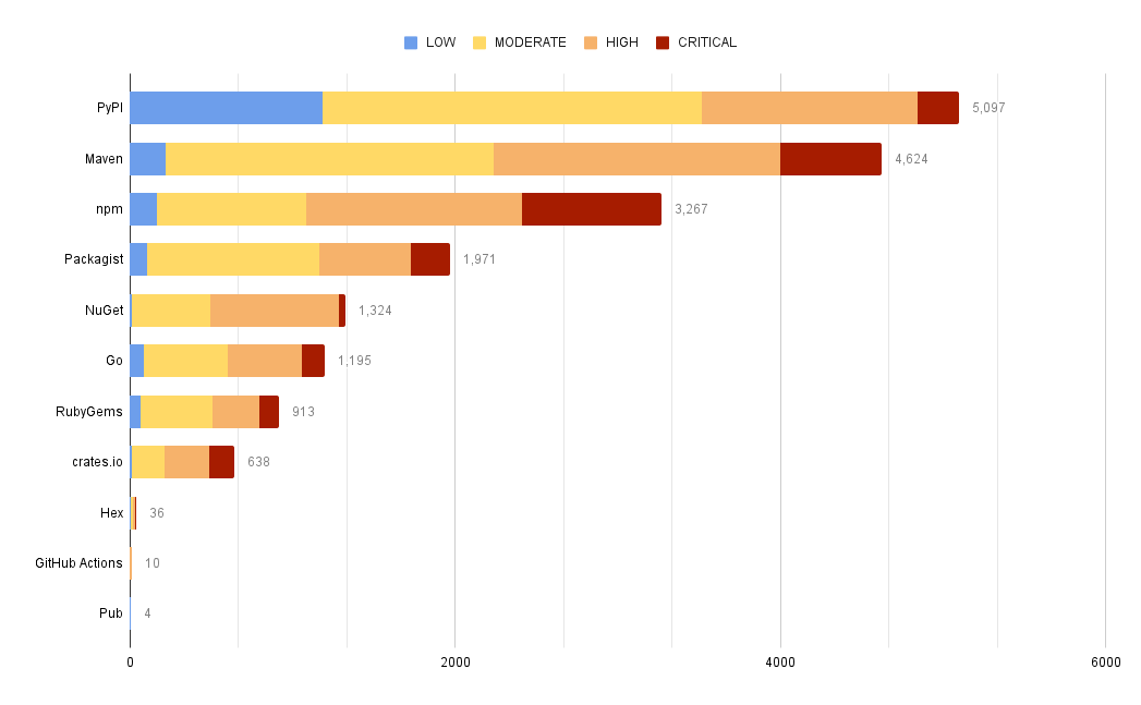 Some ecosystems have fewer advisories overall, but a higher percentage of those advisories are CRITICAL.