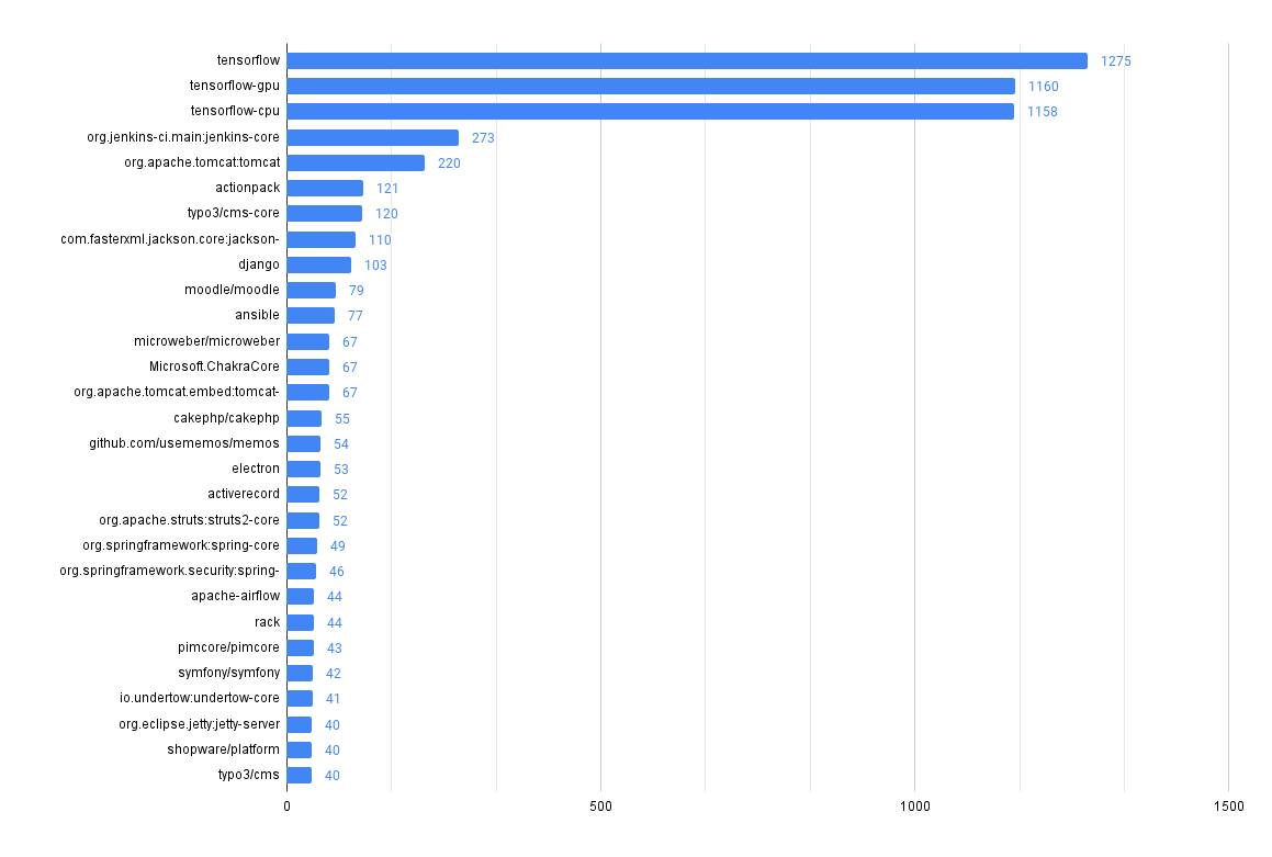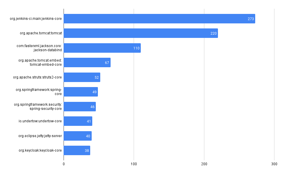 Chart showing the number of advisories by package in the Maven ecosystem
