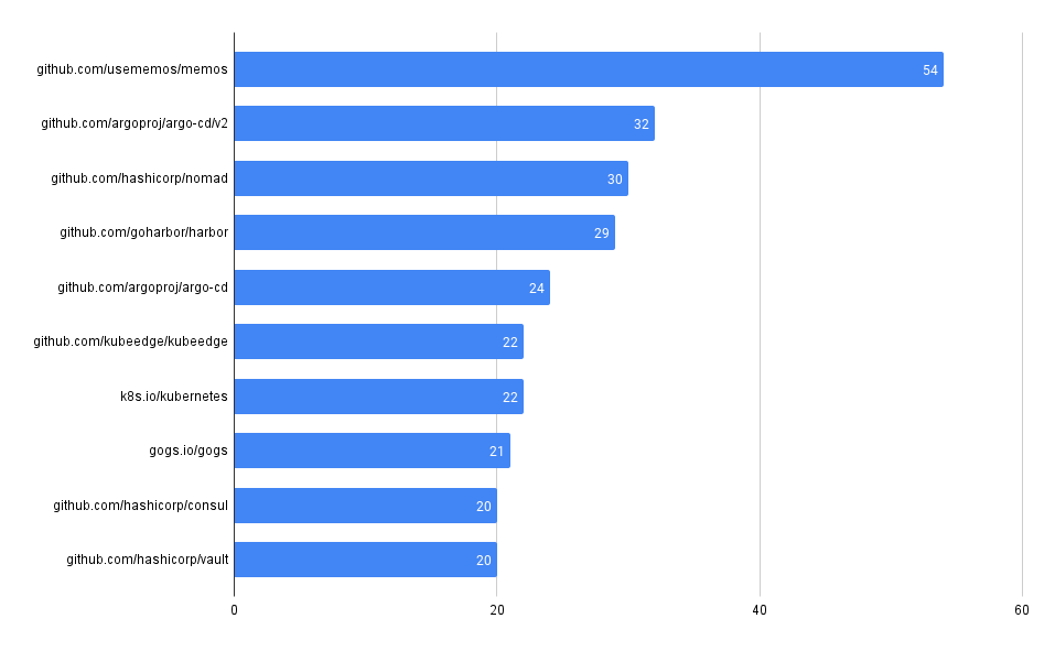Chart showing the number of advisories by package in Go ecosystem