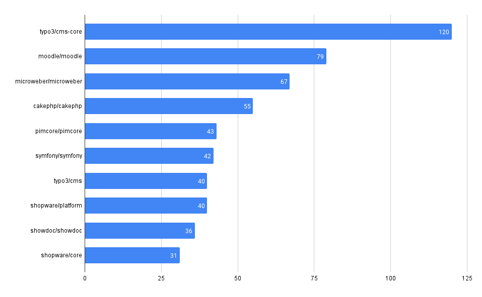 Chart showing the number of advisories by package in the Packagist ecosystem