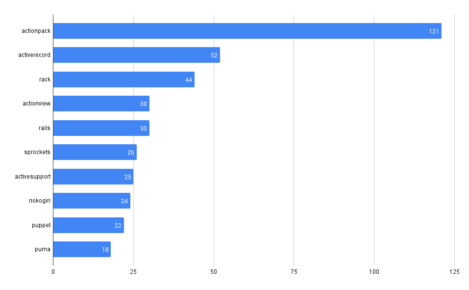Chart showing the number of advisories by package in RubyGems ecosystem