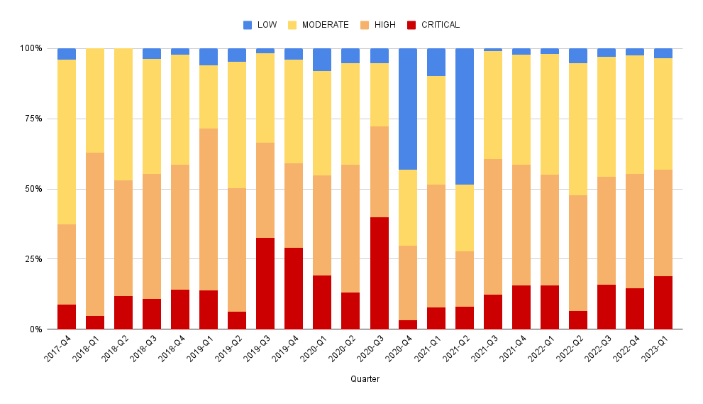 Chart showing the number of advisories by publication quarter and severity, 100% stacked With 100% stacking