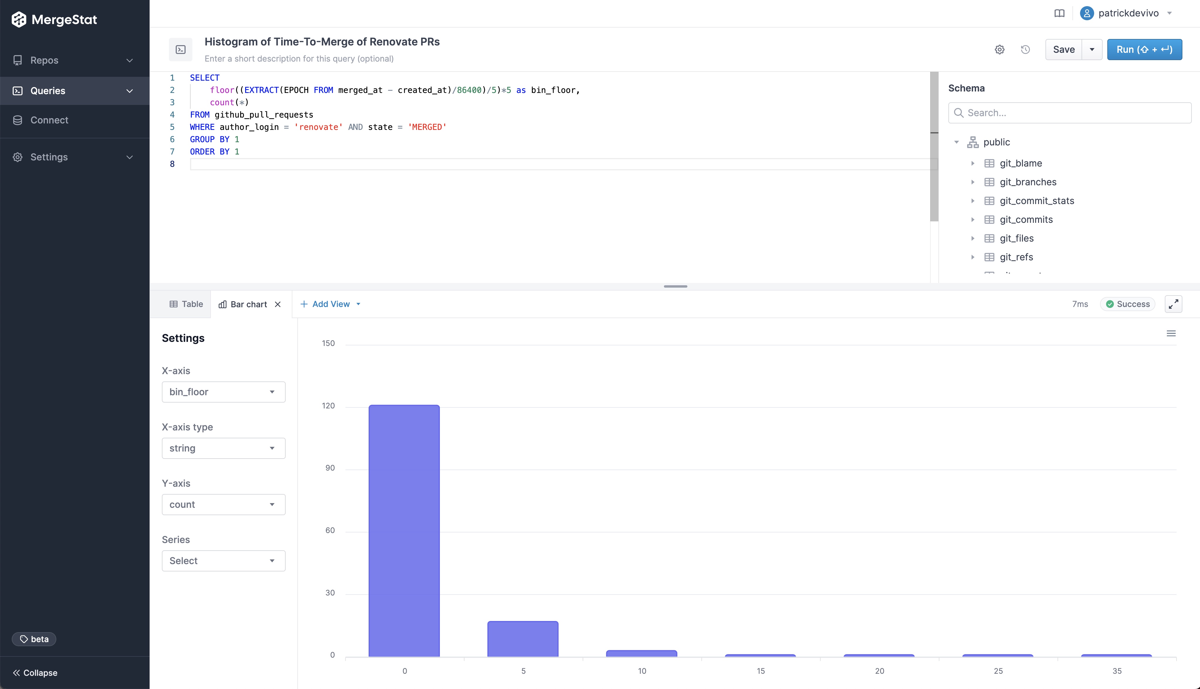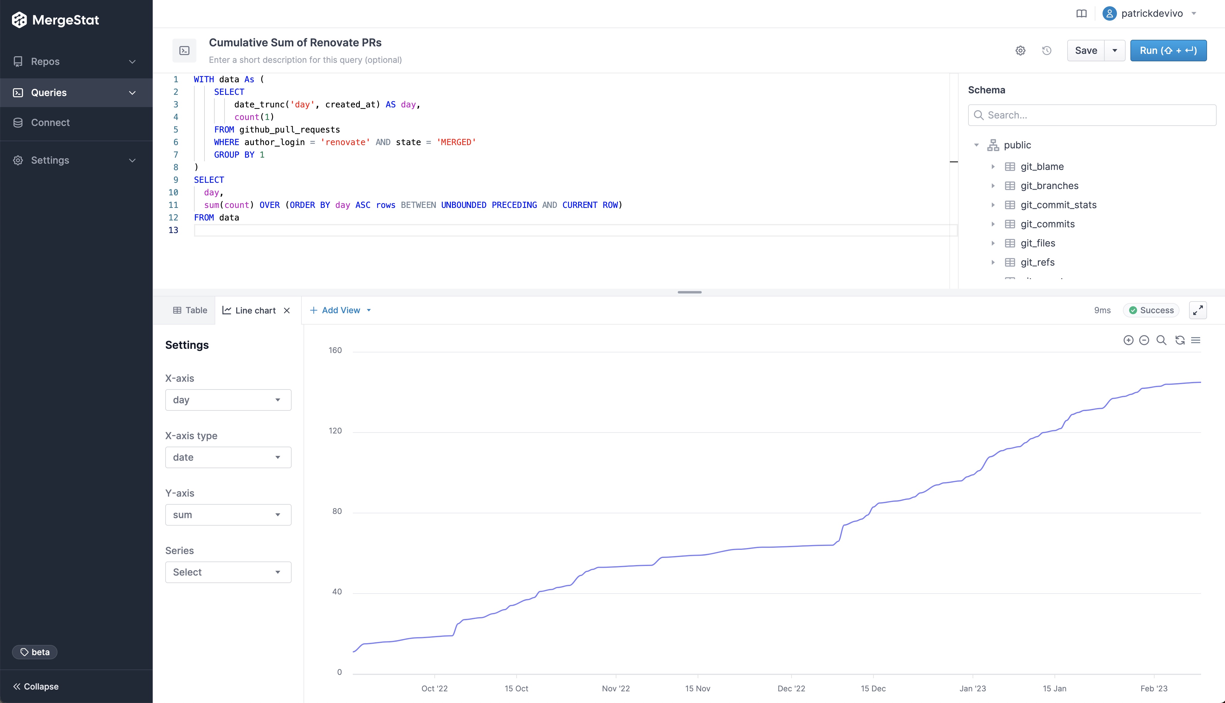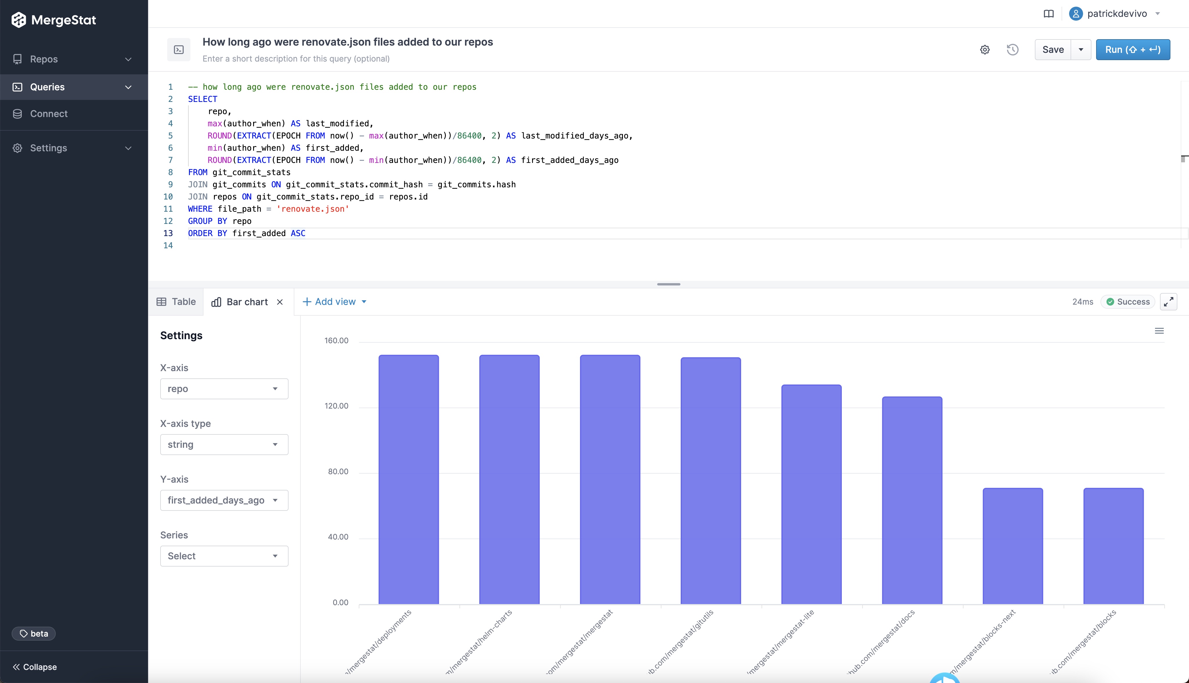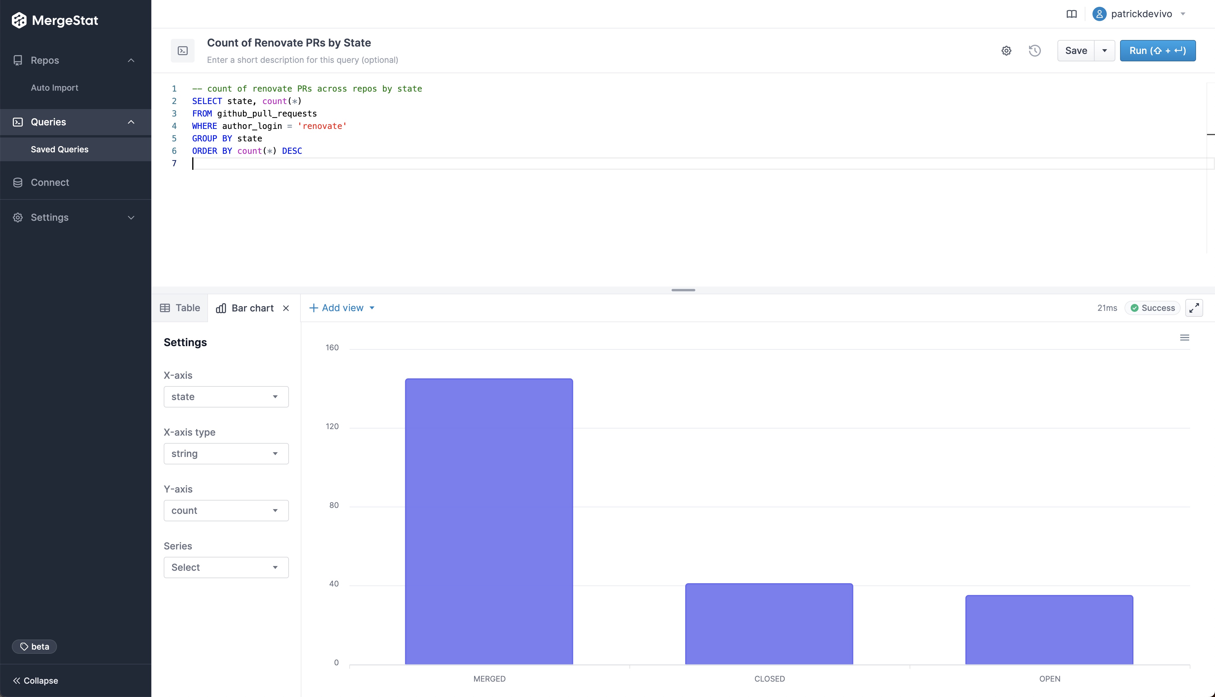 This has been one of the more frequently requested features from our early users, as it now means you don't have to bring in another BI tool (such as Grafana, Metabase, Superset, etc.) to visualize the data in your MergeStat instance. Support for direct SQL access is not going anywhere however, and nothing prevents more robust data visualizations in other tools.