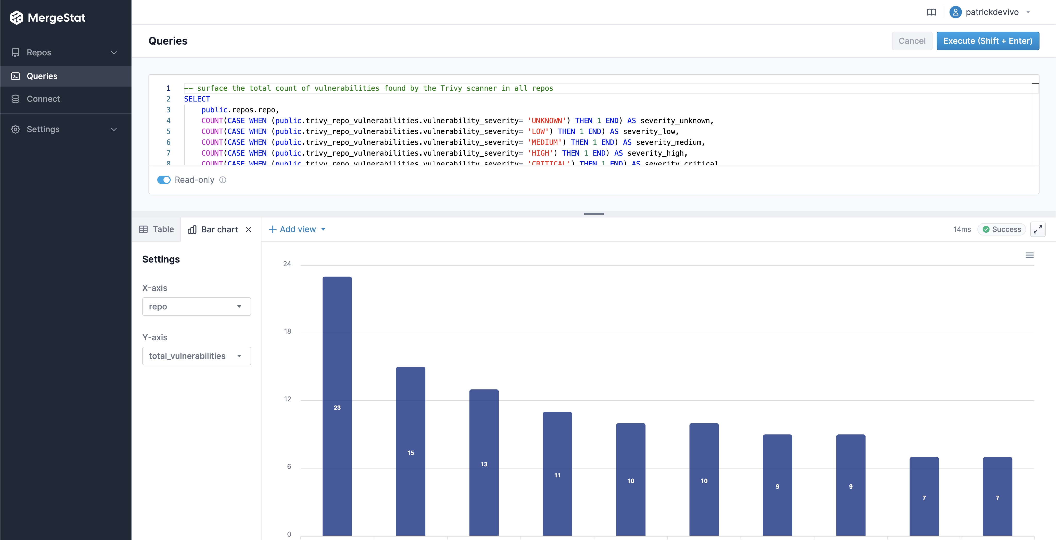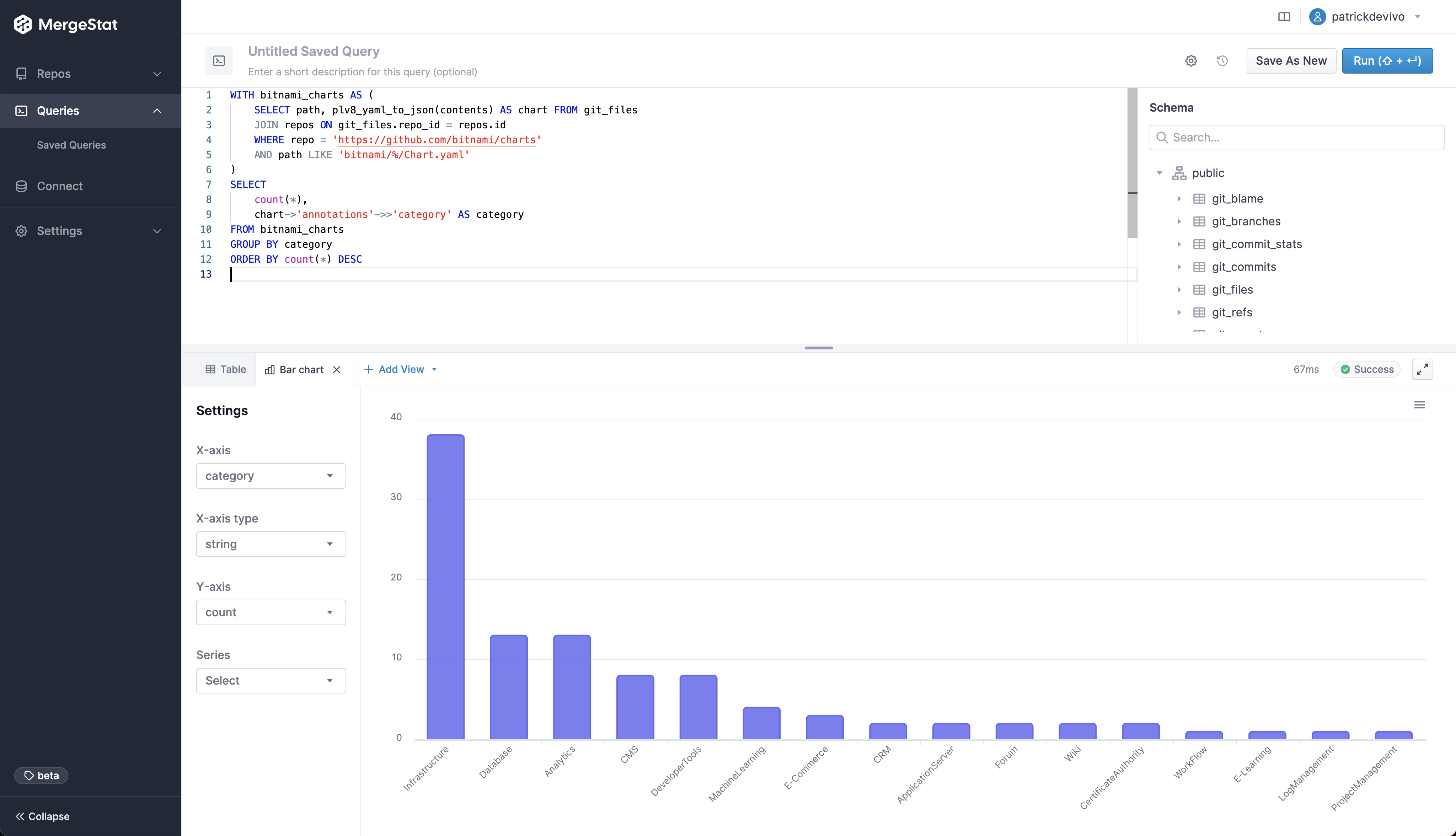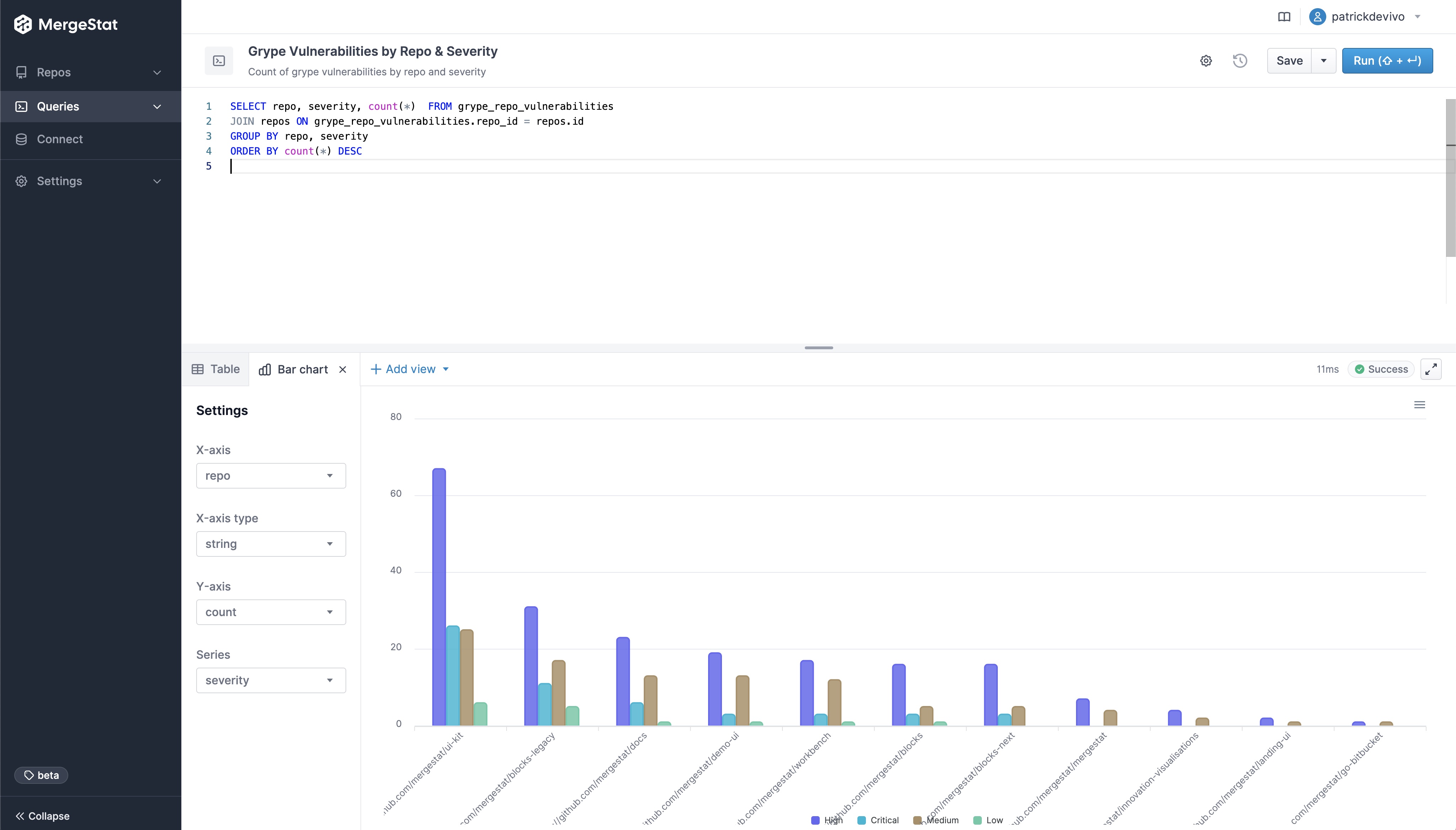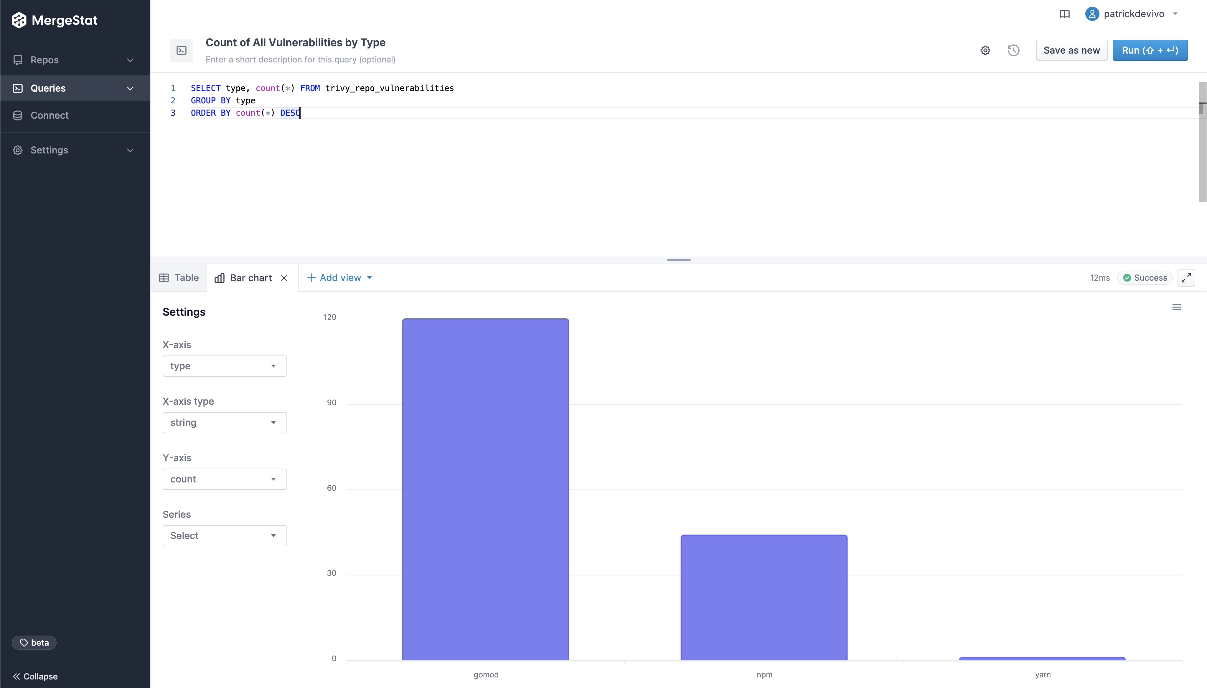 This has been one of the more frequently requested features from our early users, as it now means you don't have to bring in another BI tool (such as Grafana, Metabase, Superset, etc.) to visualize the data in your MergeStat instance. Support for direct SQL access is not going anywhere however, and nothing prevents more robust data visualizations in other tools.