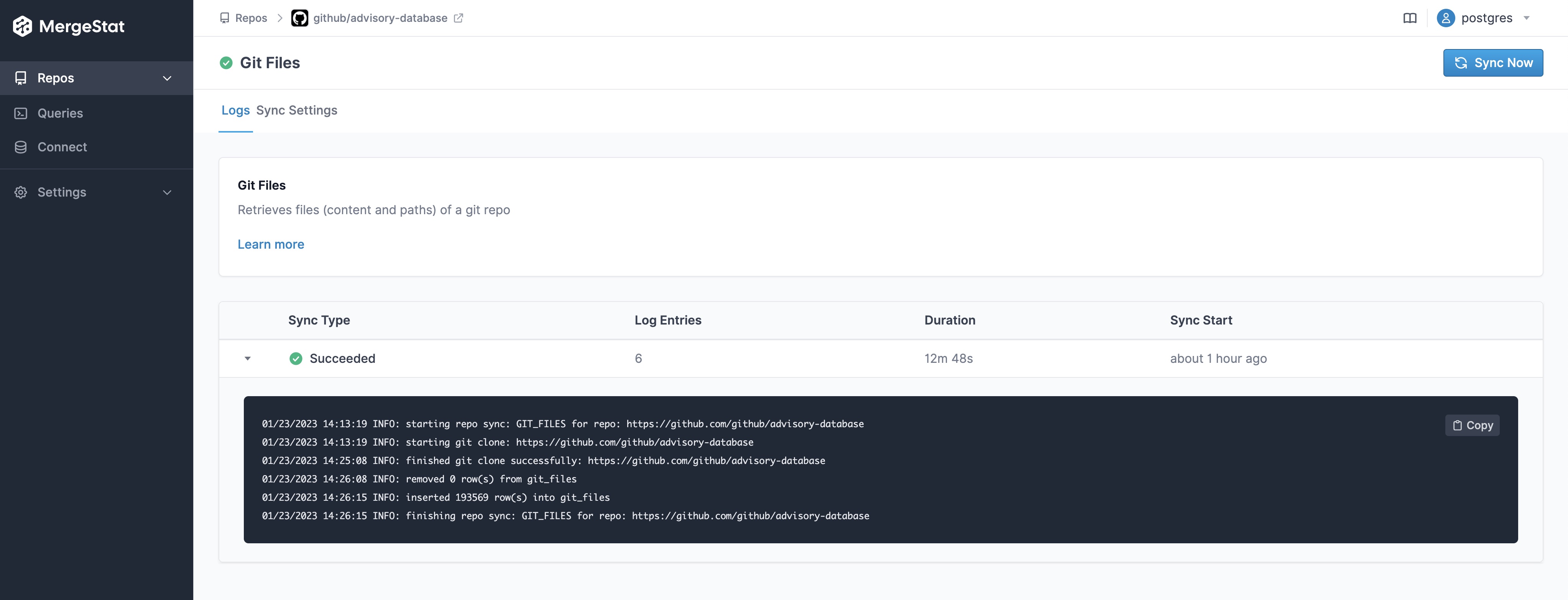 We followed the getting started instructions to get a new local instance of MergeStat running with docker-compose. Since this is a public GitHub repo (and we're looking at the data brought in by the GIT_FILES syncer), we don't need to configure any authentication, we can just bring the repo in directly, and sync the file contents: