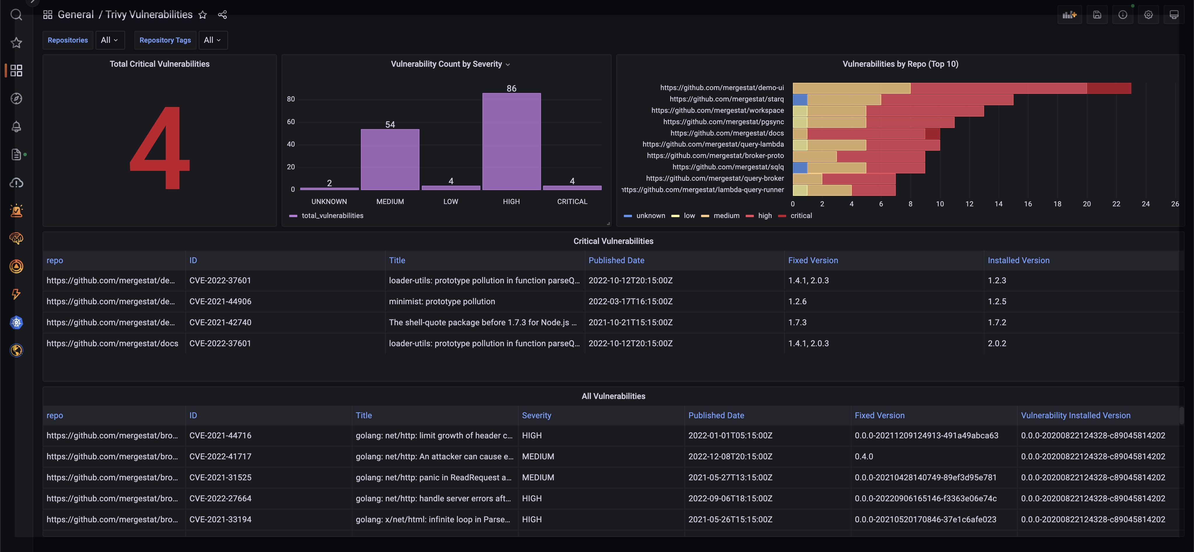 • Connect a BI tool directly to the MergeStat PostgreSQL instance to see vulnerability data in a single dashboard