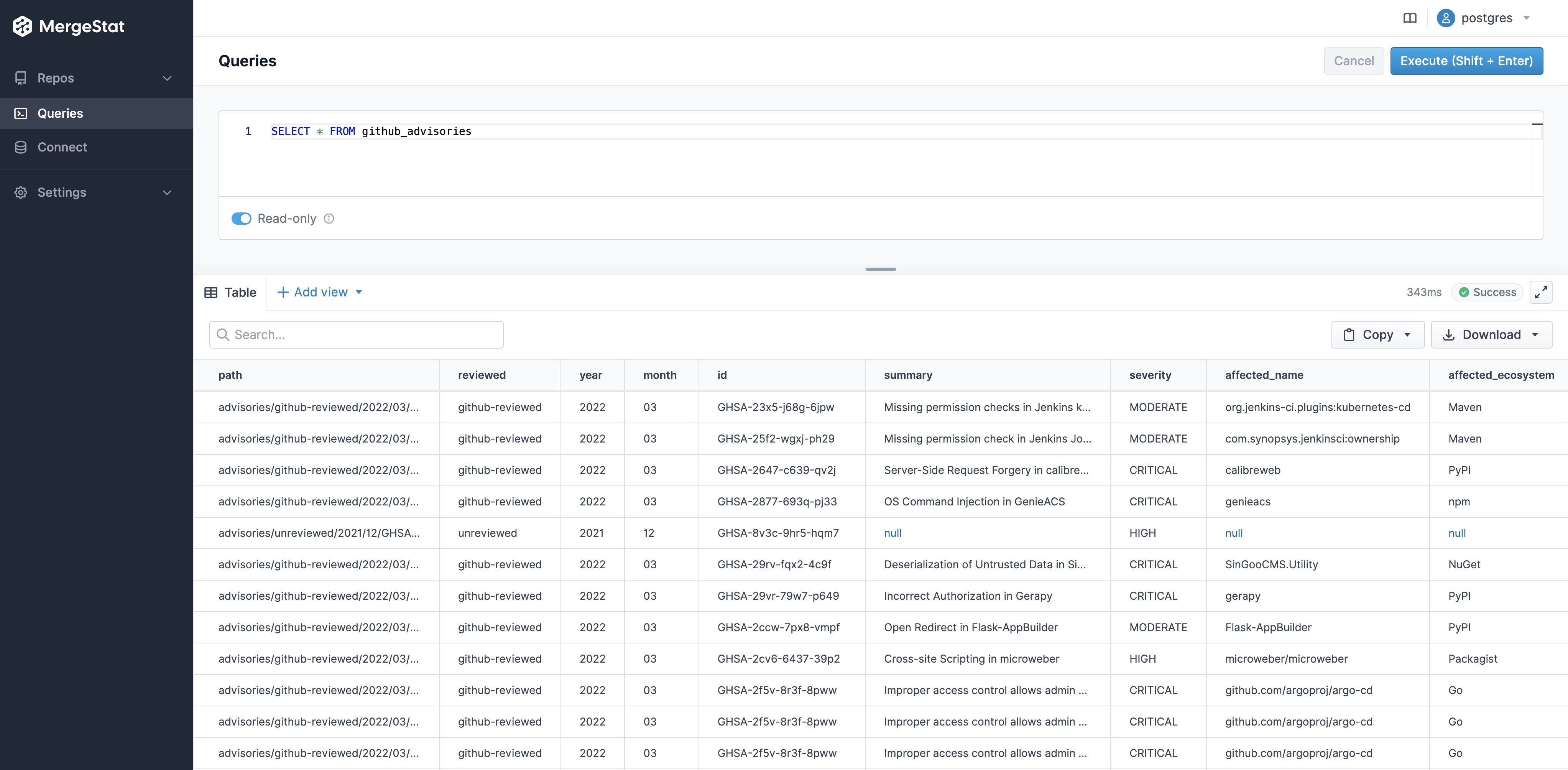 Screenshot of the MergeStat app running a SQL query to list all advisories